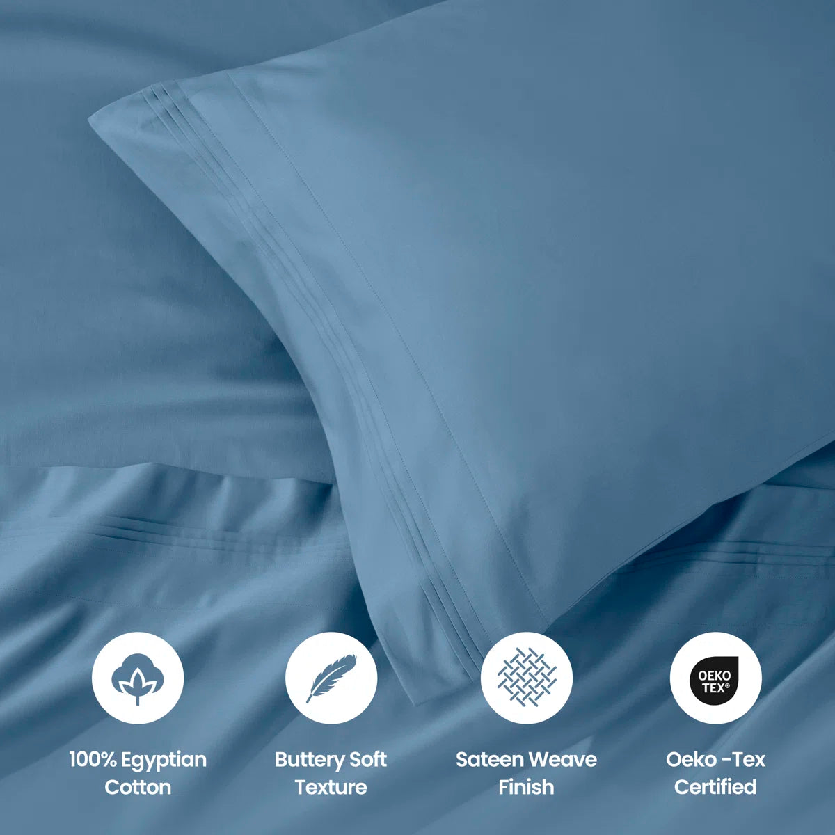 Dress your bed with the elegant style and luxury comfort of our Certified Egyptian Cotton 1000 Thread Count Deep Pocket Sheet Set. Crafted from luxurious Egyptian Cotton, these sheets boast a rich, buttery-smooth feel and a luminous sheen from the sateen weave finish. The extra long fibers of Egyptian Cotton are spun into fine, strong yarns making this material breathable, plush and more durable than other varieties of Cotton. Available in a variety of color options and sizes, this bedding set will instantly refresh any bedroom. Each piece in this set is STANDARD 100 and MADE IN GREEN by OEKO-TEX Certified. Not only tested for harmful substances, but produced in sustainable textile facilities to ensure your home has the best quality eco-friendly bedding available.