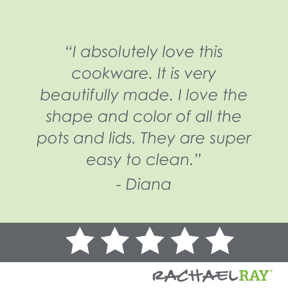 Radiant and solution-oriented, the Rachael Ray Create Delicious 13-Piece Aluminum Nonstick Cookware Set brings high performance and easy convenience to home chefs. Featuring vibrant, shimmering color combined with functionality, this collection of essential pots and pans by Rachael Ray is constructed of durable aluminum for even heat distribution to reduce hot spots. The cookware set features enhanced PlatinumShield Technology nonstick reinforced to be 9 times harder than titanium for effortless food release. Plus, all of the pots and pans are dishwasher safe for quick and easy cleanups. Colorful, dual-riveted stainless steel and silicone handles provide comfort and control that's oven safe to 400°F. Shatter resistant glass lids lock in heat and flavor while allowing foods to be monitored as they cook. Flared cookware rims make for easy pouring, and an induction-compatible stainless steel base provides strength, durability, and versatility to use the pots and pans on any cooktop. Included in the 13-piece set, a 9-inch x 12-inch cookie sheet is ready for chicken wings and cookies alike, and the nylon turner utensil will have you ready to flip and serve from the get-go. From dishwasher-safe convenience to enhanced durability of PlatinumShield nonstick, reach for the Rachael Ray Create Delicious 13-Piece Aluminum Nonstick Cookware Set. This product contains (Este producto contiene) Fluoropolymer, PTFE, FEP, PFA (PFAS), Aluminum. For more information on PFAS or chemicals in this product, visit (Para obtener mas informacion sobre PFAS o productos quimicos en este producto, visite) https://rachaelray.com/pages/product-disclosures.
